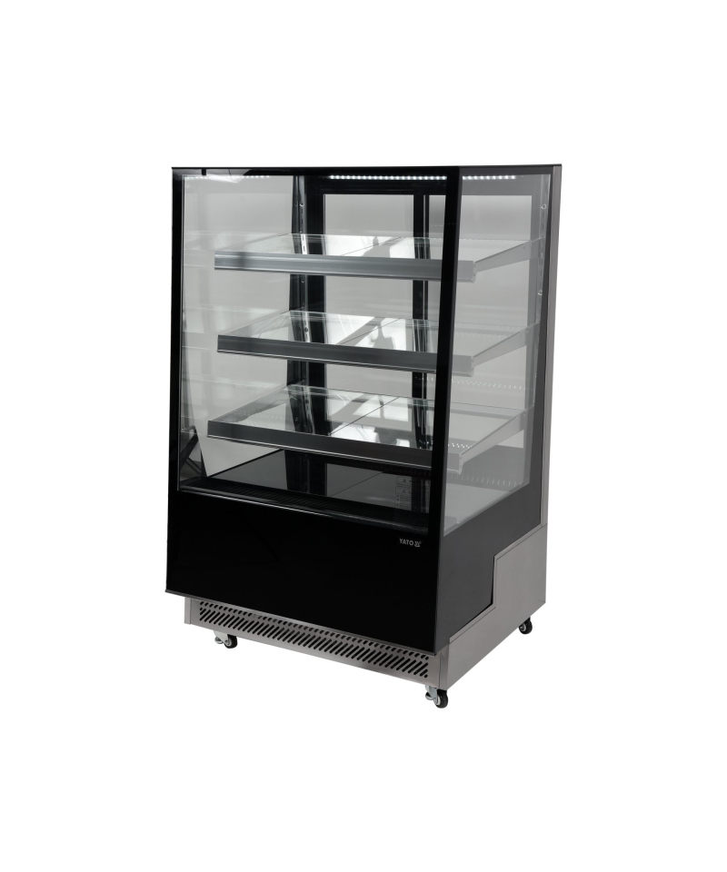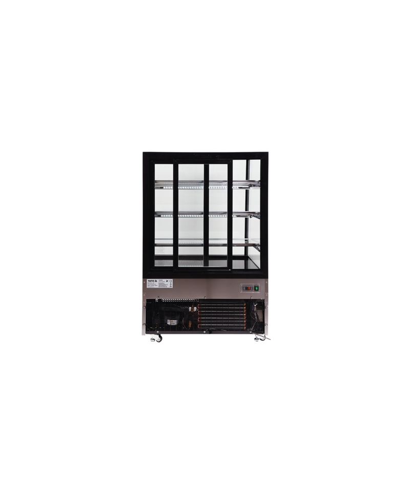 Die freistehende YATO Kühlvitrine mit 500L Fassungsvermögen in elegantem Schwarz, mit Abmessungen von 900x805x1445mm, ist die ideale Lösung für die professionelle Produktpräsentation. Entworfen für Konditoreien, Cafés, Restaurants und Einzelhandelsgeschäfte, präsentiert die YATO Vitrine perfekt Kuchen, Torten, Cocktails, Joghurts, erfrischende Getränke, sowie Salate oder kleine Snacks und animiert Kunden zur Auswahl. Modernes Design in Kombination mit hochwertigen Materialien garantiert, dass die Vitrine ein ästhetisches und funktionales Element jedes Interieurs wird.