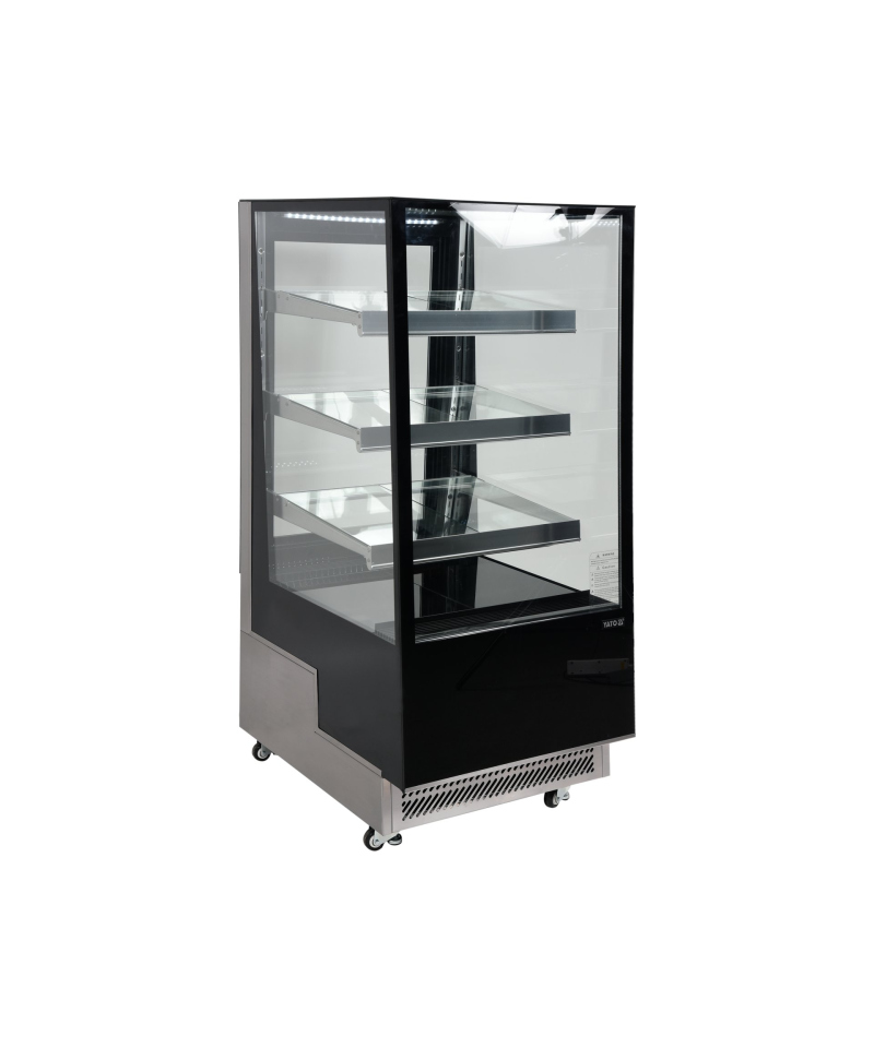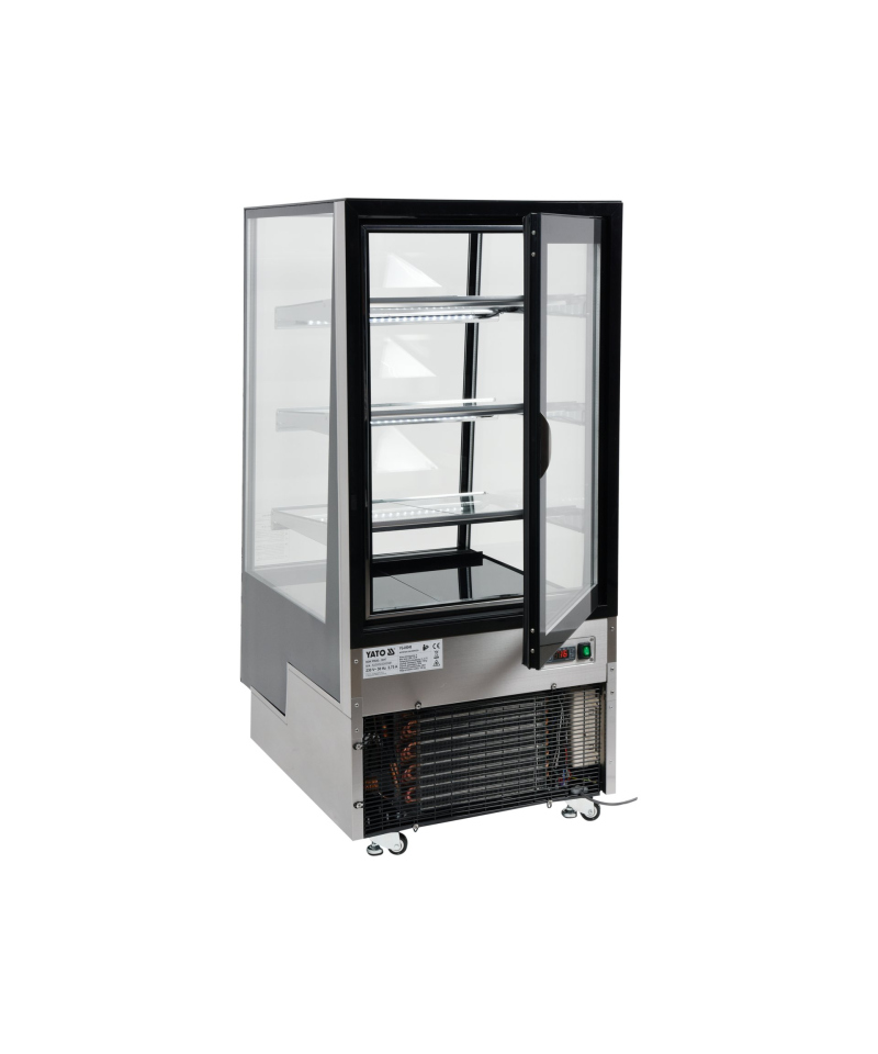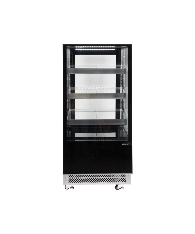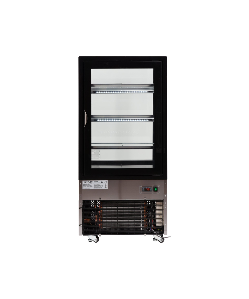 Wir präsentieren die freistehende YATO Kühlvitrine mit einem Fassungsvermögen von 350L in einem eleganten schwarzen Finish, mit Abmessungen von 650x805x1445mm. Diese professionelle YATO Vitrine wurde für die effektive Präsentation einer breiten Palette von Produkten entwickelt – von exquisiten Kuchen und Torten, über erfrischende Cocktails, Joghurts und Getränke, bis hin zu frischen Salaten und kleinen Snacks. Die Kombination aus modernem Design und hochwertigen Materialien macht die YATO Kühlvitrine zu einer hervorragenden Ergänzung für Konditoreien, Cafés, Restaurants und verschiedene Verkaufsstellen, die die Aufmerksamkeit der Kunden auf sich zieht. Die integrierte LED-Beleuchtung, unter jedem Regal platziert, unterstreicht perfekt die ästhetischen Qualitäten der präsentierten Produkte und regt zur Auswahl an. Die YATO Vitrine mit einem Fassungsvermögen von 350L ist mit drei Glasablagen mit höhenverstellbarer Befestigung ausgestattet, was eine flexible Anpassung des Raumes an unterschiedliche Bedürfnisse ermöglicht. Der Zugang zum Innenraum erfolgt über bequeme, zu öffnende Glastüren. Sowohl die Türen als auch die vorderen und seitlichen Scheiben bestehen aus doppelschichtigem gehärtetem Glas, was nicht nur eine hohe Haltbarkeit, sondern auch hervorragende Isolationseigenschaften garantiert. Die Vitrine arbeitet in einem optimalen Temperaturbereich von 0 bis 12°C und verwendet das umweltfreundliche Kältemittel R290. Die angewandte Umluftkühlungstechnologie in Kombination mit der automatischen Abtaufunktion gewährleistet einen äußerst effizienten und energieeffizienten Betrieb. Die Umluftkühlung garantiert eine gleichmäßige Luftverteilung in der gesamten Vitrine und hält eine stabile Temperatur auf jedem Regal. Der durchschnittliche jährliche Energieverbrauch beträgt 2669 kWh. Die intuitive Steuerung der Vitrine erfolgt über ein elektronisches Panel mit einer übersichtlichen Temperaturanzeige. Die YATO Vitrine mit 450W Leistung und Abmessungen von 650x805x1445mm ist trotz ihrer Größe außergewöhnlich leicht zu manövrieren. Dank der speziell entwickelten Rollen lässt sie sich ohne geringste Anstrengung an jeden beliebigen Ort verschieben. Zusätzlich ermöglichen ausziehbare stabilisierende Füße eine präzise Nivellierung des Geräts, um dessen sichere und stabile Positionierung zu gewährleisten.
