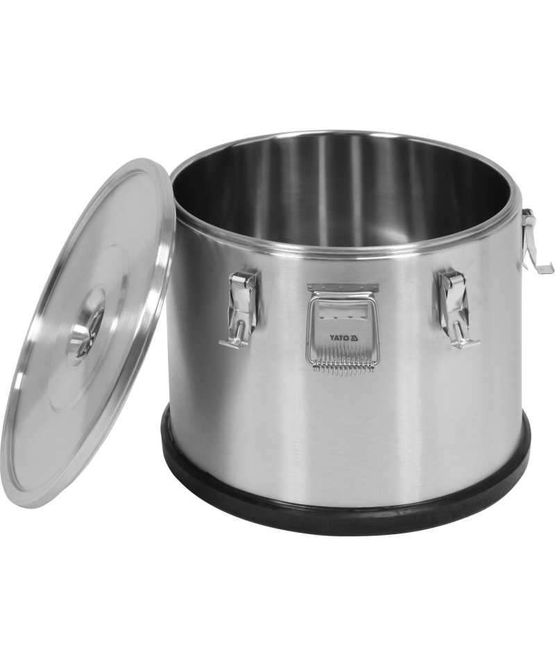 Für Komfort und Sicherheit beim Transport ist die Wärmeisolier-Thermoskanne mit zwei soliden, aus Edelstahl gefertigten, massiven Griffen ausgestattet. Der Deckel wird mit sechs robusten Verschlüssen sicher befestigt, was Stabilität und Dichtheit gewährleistet. Die hohe Qualität und Langlebigkeit all dieser Elemente sichern eine langjährige, zuverlässige Nutzung. Zusätzlich ist der Boden der YATO Thermoskannen mit einer Gummiauflage geschützt, die ein Verrutschen des Behälters auf Oberflächen während des Transports effektiv verhindert und sowohl die Thermoskanne als auch den Untergrund schützt.