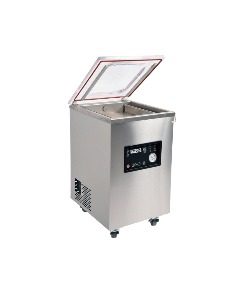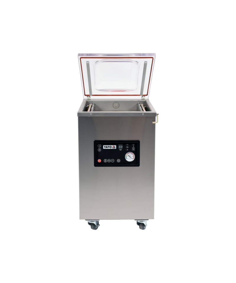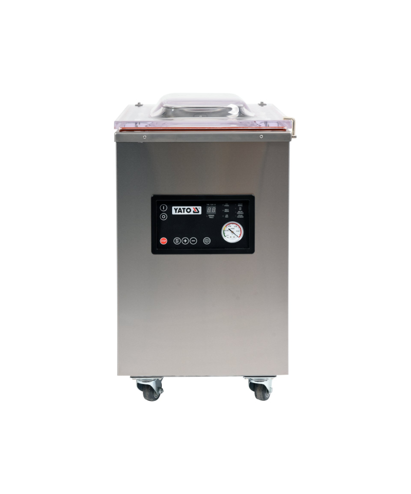 Die YATO Vakuumverpackungsmaschine ist ein Synonym für Langlebigkeit, hergestellt aus hochwertigsten Rohstoffen. Die Vakuumkammer mit den Maßen 440x310x75 (125) mm wurde aus dickem, massivem Edelstahl gefertigt, was eine außergewöhnlich lange und problemlose Betriebsdauer gewährleistet. Ihre abgerundeten Formen erleichtern die Aufrechterhaltung perfekter Hygiene. Der Gerätedeckel, aus sehr widerstandsfähigem, transparentem Kunststoff gefertigt, ermöglicht eine laufende Überwachung und volle Kontrolle über den Verpackungsprozess. Zusätzlich erhöht eine spezielle Vertiefung im Deckel intelligent die Kammerhöhe von 75 mm auf 125 mm, was ein problemloses Verpacken auch größerer Produkte ermöglicht.