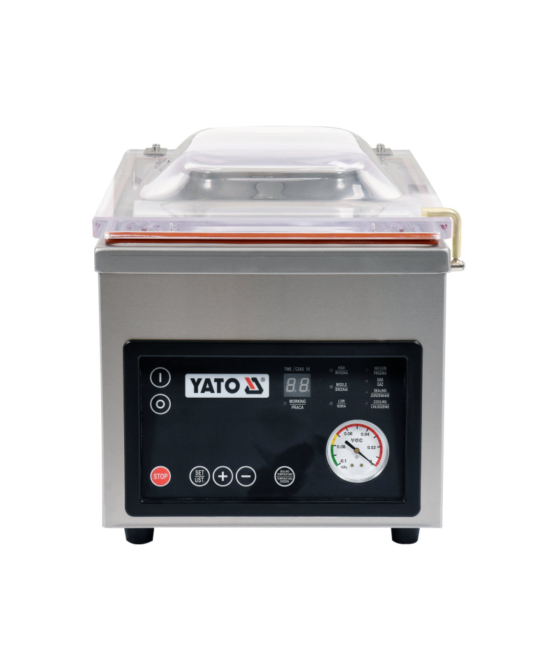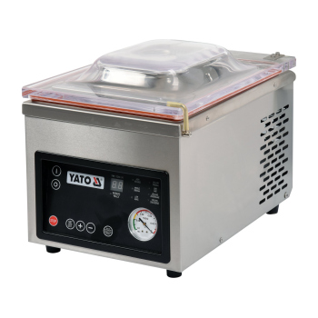 Das YATO Vakuumiergerät zeichnet sich durch seine Konstruktion aus hochwertigsten Rohstoffen aus. Die Vakuumkammer mit den Maßen 385 x 280 x 50 (100) mm ist aus dickem und massivem Edelstahl gefertigt, was eine außergewöhnliche Haltbarkeit und langlebigen Einsatz gewährleistet. Die abgerundeten Formen des Kammerinneren erleichtern die makellose Sauberkeit erheblich. Der Gerätedeckel, aus sehr massivem, transparentem Kunststoff gefertigt, ermöglicht die laufende Überwachung des Verpackungsprozesses und dessen vollständige Kontrolle. Darüber hinaus ermöglicht eine innovative Vertiefung im Deckel eine Erhöhung der effektiven Kammerhöhe von 50 mm auf 100 mm, was die Möglichkeit eröffnet, Produkte größerer Abmessungen zu verpacken.