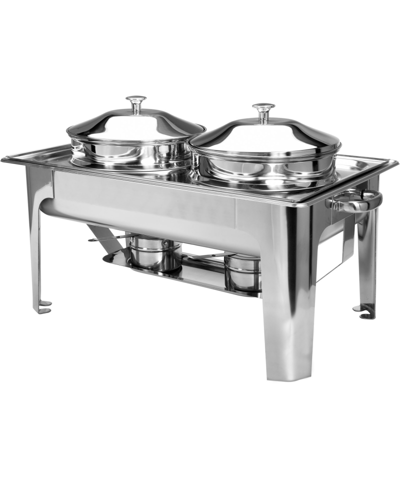 Das Set enthält zwei Speisebehälter mit Deckeln, aus Edelstahl gefertigt, jeder mit einem Durchmesser von 220mm, einer Höhe von 140mm und einem beeindruckenden Fassungsvermögen von 4,5L, ideal zum Servieren verschiedener Gerichte. Der Wärmer ist außerdem mit zwei Brennpastebehältern und einer speziellen Halterung ausgestattet, die die optionale Montage einer elektrischen Heizung ermöglicht und so die Vielseitigkeit des Geräts erhöht.