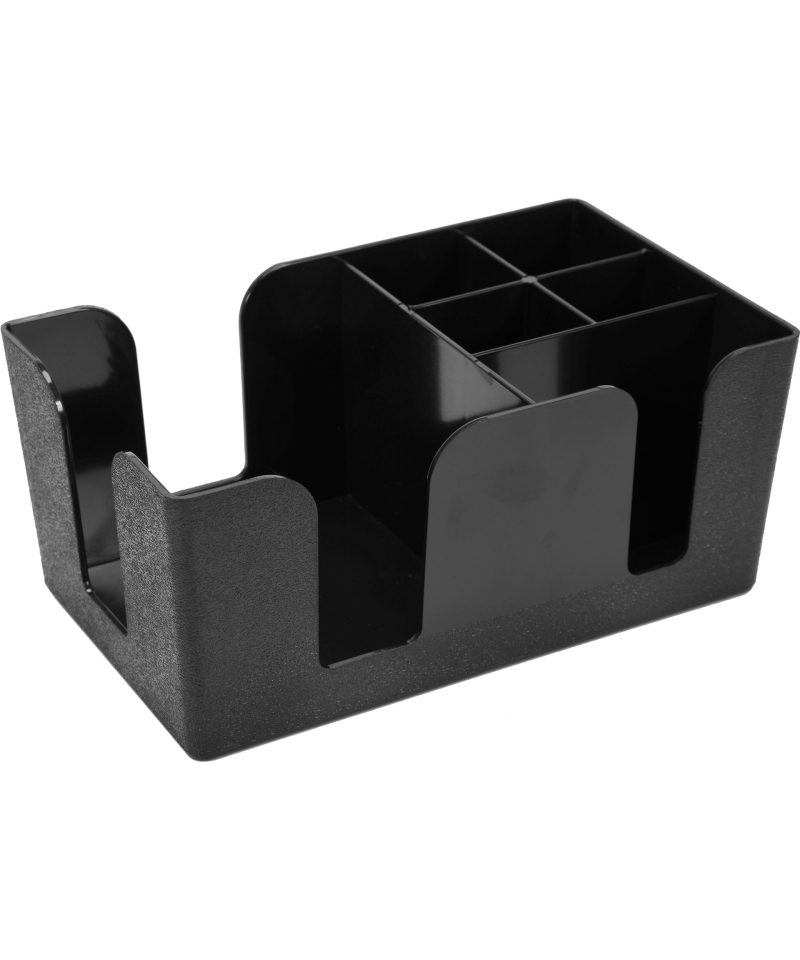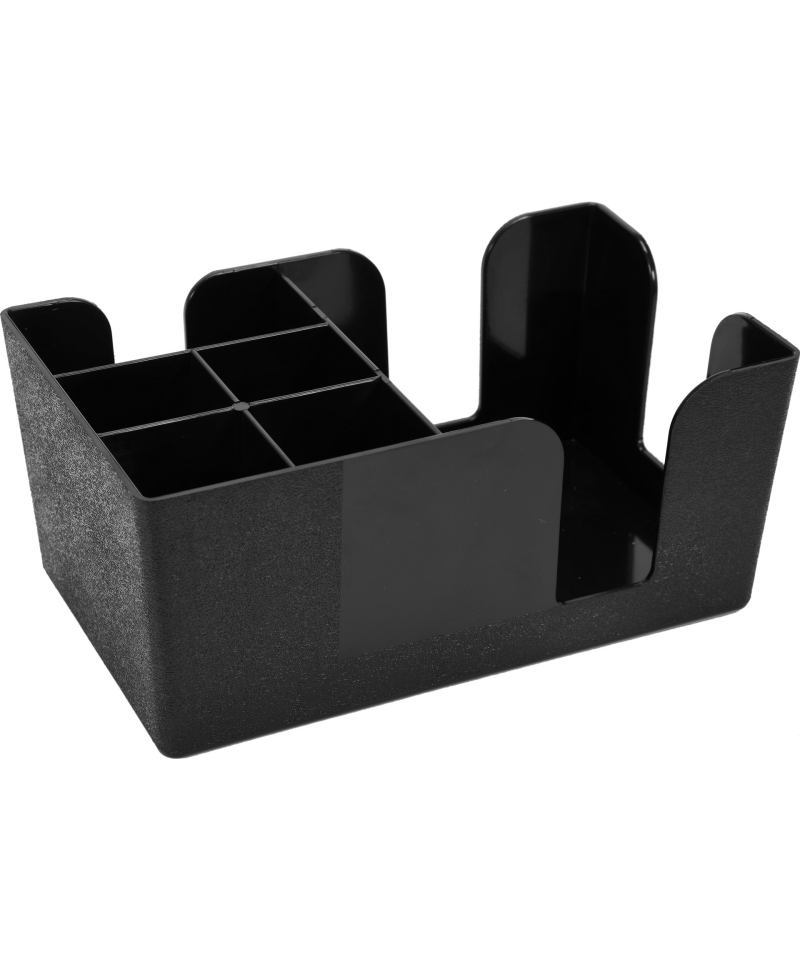 Hergestellt aus extrem widerstandsfähigem ABS-Kunststoff in elegantem Schwarz, zeichnet sich der Organizer durch seine ästhetische Verarbeitung aus. Sein modernes Design fügt sich perfekt in die Einrichtung jeder Bar, jedes Restaurants oder Catering-Points ein und verleiht ihm einen professionellen Charakter.