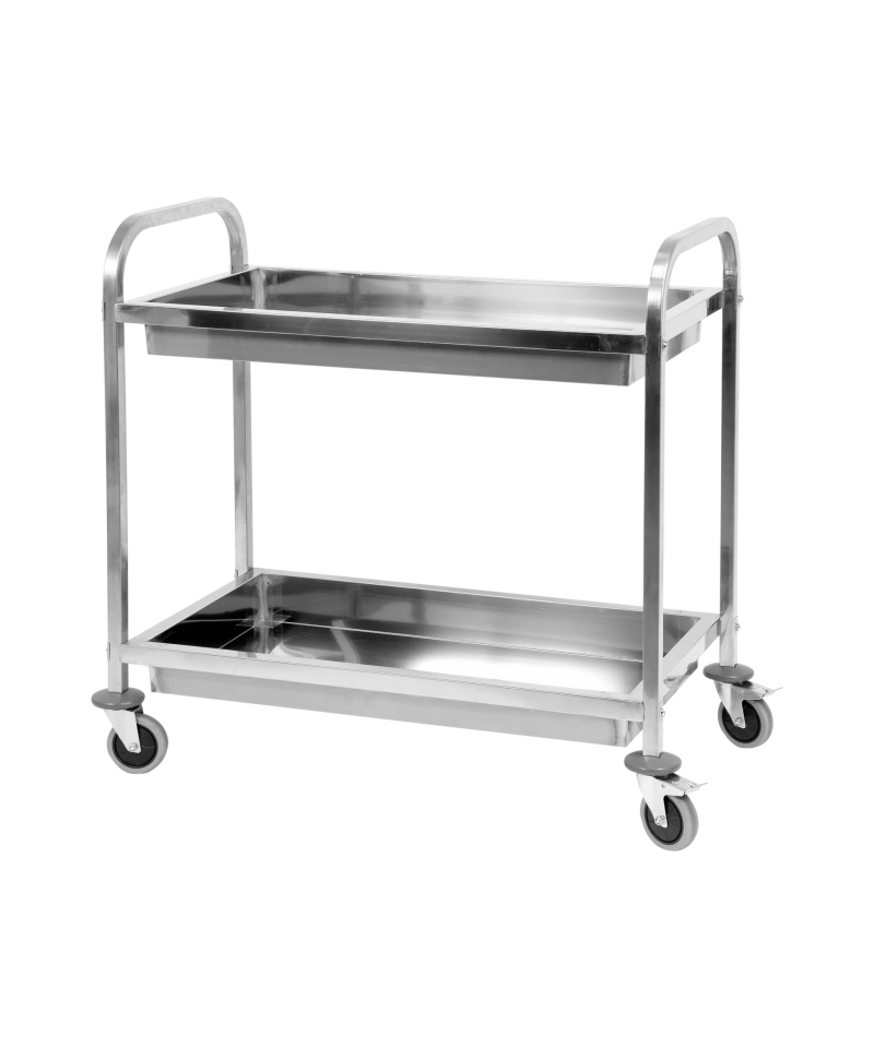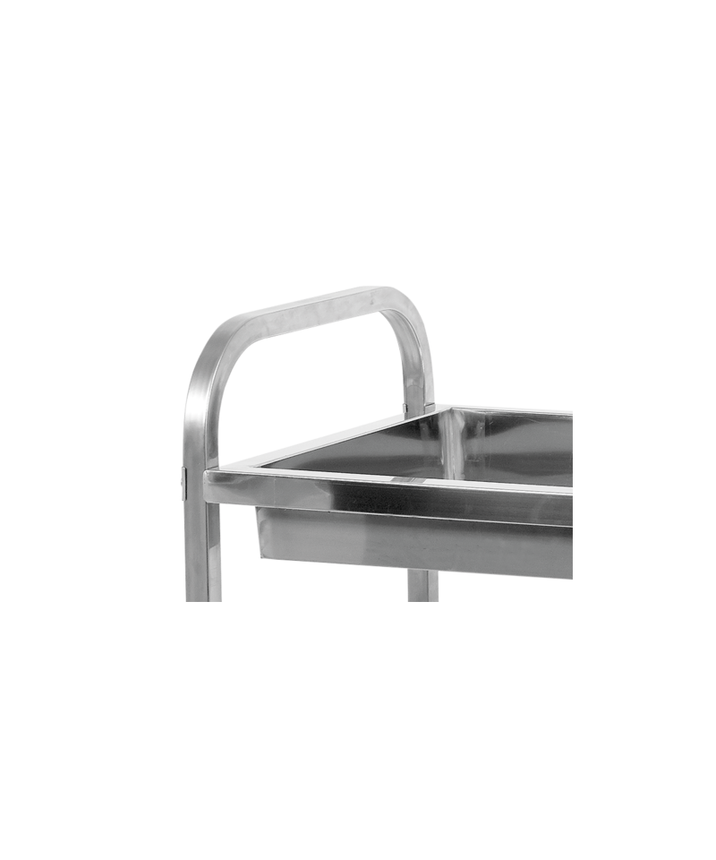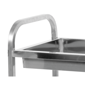 Die Konstruktion des Wagens basiert auf **hochwertigem Edelstahl des Typs 201**, was nicht nur eine außergewöhnliche Korrosionsbeständigkeit, sondern auch eine einfache Hygiene und einen langfristigen, problemlosen Einsatz gewährleistet – auch unter Außenbedingungen. Der Arbeitskomfort wird durch **schalldämmende Matten** erhöht, die unter jedem Regal platziert sind. Hergestellt aus speziellem Schaumstoff, dämpfen sie effektiv Vibrationen und Geräusche, die während des Transports entstehen, und gewährleisten einen leisen und reibungslosen Betrieb. Zwei geräumige **Regale, jedes mit den Maßen 820 x 430 mm und 90 mm Tiefe**, sind mit einem erhöhten Rand ausgestattet, der transportierte Produkte effektiv vor dem Abrutschen schützt. Zusätzlich wurden alle Kanten des Wagens sorgfältig abgerundet, was die Sicherheit des Personals im täglichen Betrieb erheblich erhöht.