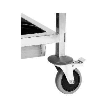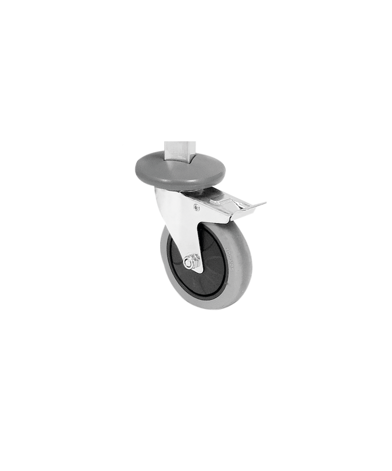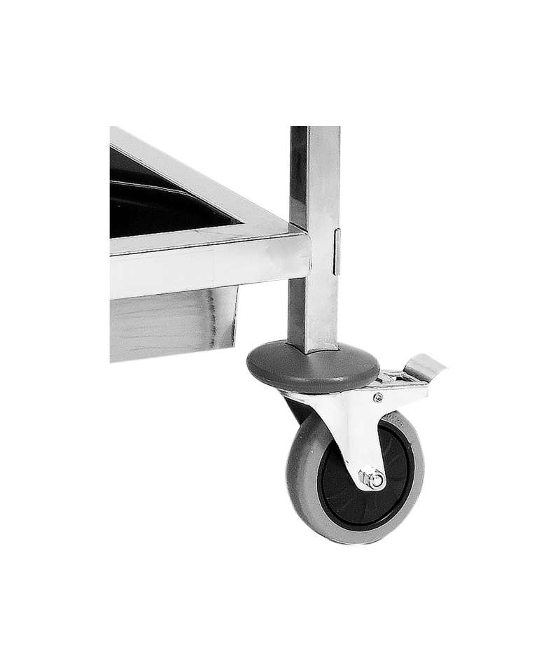 Die Mobilität des Wagens wird durch **4 hochwertige Rollen mit Lagern**, die aus strapazierfähigem, grauem **TPR**-Material gefertigt sind, gewährleistet. Dieses innovative Material, das Härte mit Flexibilität verbindet, garantiert einen extrem leisen Betrieb, zerkratzt keine Böden und hinterlässt keine unschönen Spuren. Die Rollen sind voll **um 360° schwenkbar**, was ein äußerst präzises Manövrieren in engen Räumen und schmalen Gängen ermöglicht. Zur Erhöhung der Sicherheit und Stabilität sind **zwei der Rollen mit zuverlässigen Bremsen ausgestattet.**