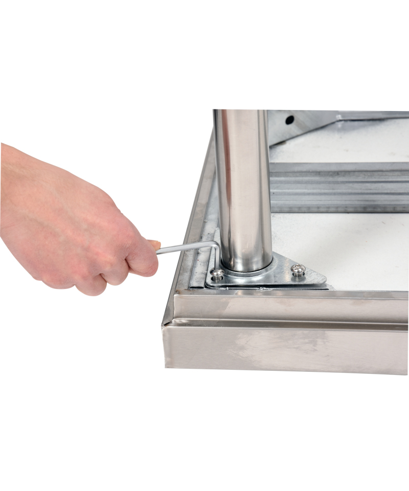 Die robusten Tischbeine, gefertigt aus massiven Rundprofilen, sind mit einer präzisen Höhenverstellung im Bereich von +/-15 mm ausgestattet. Dies ermöglicht eine perfekte Nivellierung des Tisches auch auf den unebensten Oberflächen. Zusätzlich schützen spezielle Kunststoffunterlagen den Boden effektiv vor Kratzern.