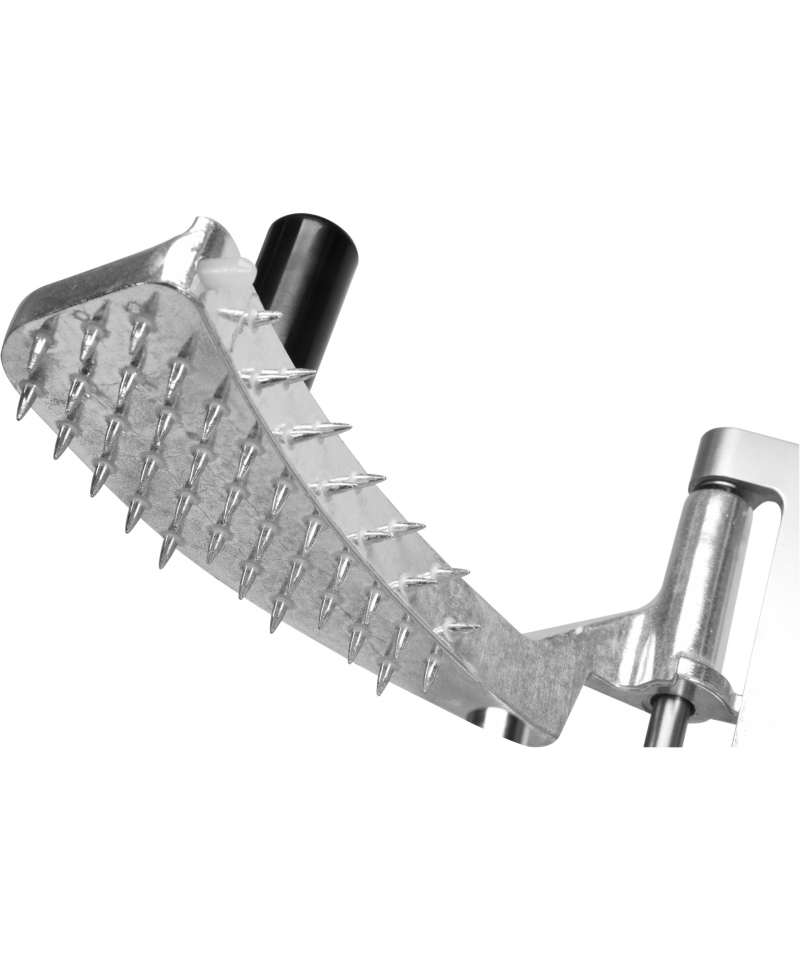Der Schlitten, gelagert auf präzisen Führungen mit Kugellagern, zeichnet sich durch eine äußerst leichte und reibungslose Arbeitsweise aus, was den Kraftaufwand des Bedieners beim Schneiden minimiert. Darüber hinaus wurde der gesamte Schneidmechanismus – sowohl der Schlitten als auch die Klinge – schräg angeordnet. Dank dieser innovativen Lösung werden die zu schneidenden Produkte durch die Schwerkraft natürlich an die Klinge gedrückt, was den erforderlichen Anpressdruck erheblich reduziert und den Bedienkomfort erhöht.