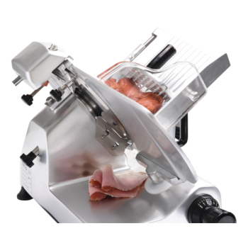 Die robuste Schneidscheibe mit 220mm Durchmesser bewältigt mühelos Produkte mit einem Durchmesser von bis zu 150mm. Dank der innovativen stufenlosen Schnittstärkenregulierung hat der Benutzer die volle Kontrolle über die Präzision und erzielt ideale Scheiben mit einer Dicke von 0,2 bis 12mm.