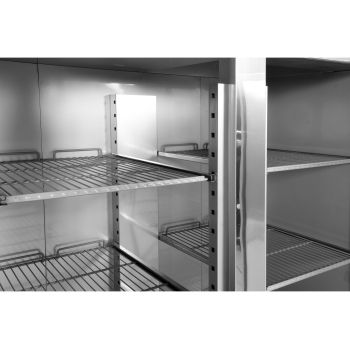Dieses Modell zeichnet sich durch praktische selbstschließende Türen aus, die dank des eingebauten Schlosses Sicherheit und dank bequemer Griffe Bedienkomfort bieten. Im Inneren befinden sich pro Tür 3 robuste, PVC-beschichtete Gitterroste, jeder mit einer beeindruckenden Tragfähigkeit von bis zu 40kg (bei gleichmäßiger Belastung). Diese Regale sind ideal für die Lagerung von GN 2/1 Behältern geeignet. Zusätzlich ist der Innenraum der Kammer hell beleuchtet, was das schnelle Auffinden von Produkten erleichtert.