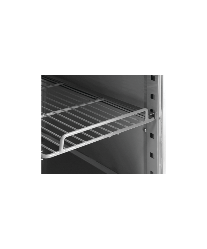 Die Funktionalität wird durch selbstschließende Türen erhöht, die zur Erhöhung der Sicherheit mit einem robusten Schloss und einem ergonomischen Griff ausgestattet sind. Im Inneren befinden sich pro Tür 3 robuste, PVC-beschichtete Gitterroste, jeder mit einer beeindruckenden Tragfähigkeit von bis zu 40 kg (bei gleichmäßiger Belastung), ideal zur Aufbewahrung von GN 2/1 Behältern. Zusätzlich ist der Innenraum der Kühlkammer hell beleuchtet, was die Organisation und den Zugang zu den Produkten erleichtert.