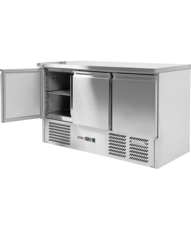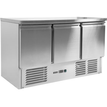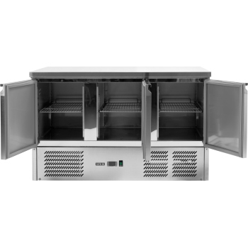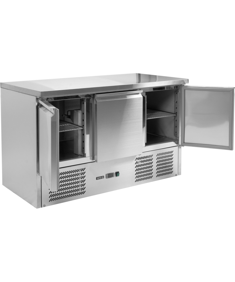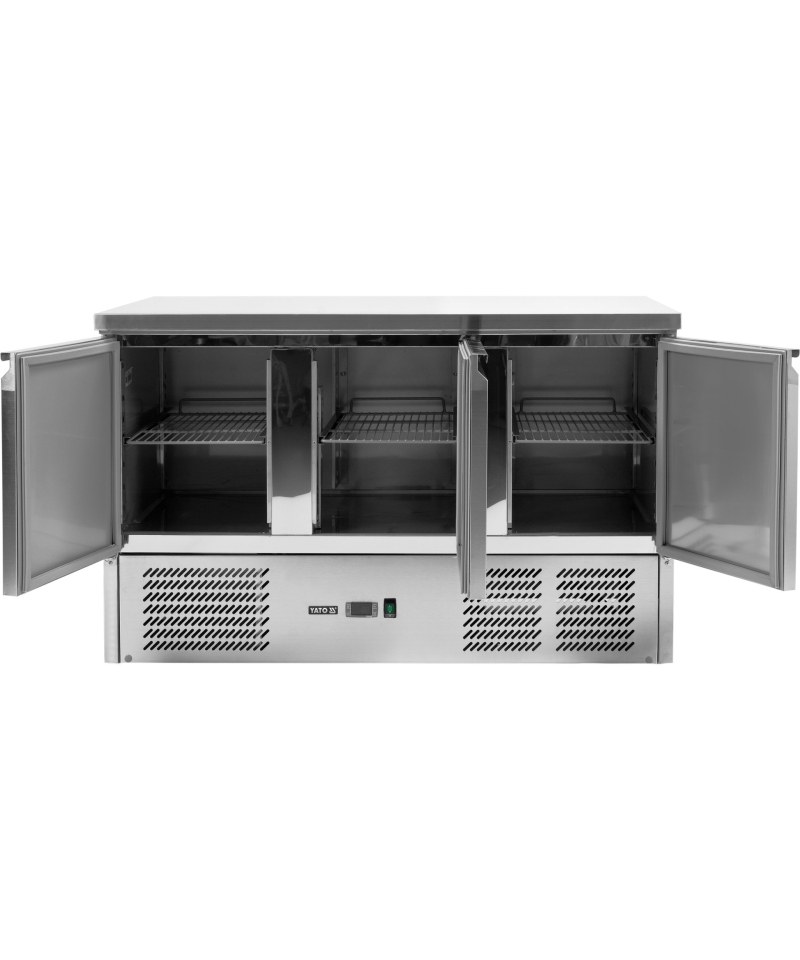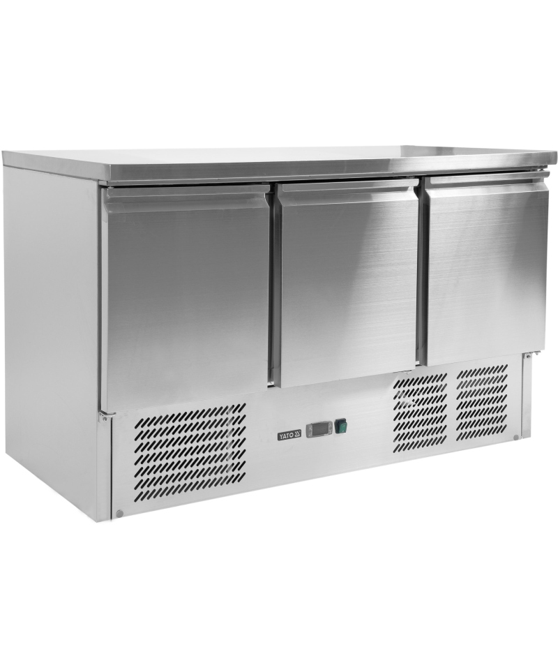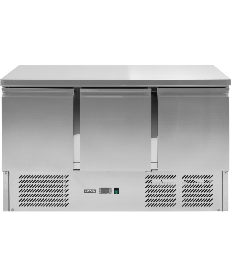 Wir präsentieren einen professionellen 3-türigen Kühltisch mit funktionaler Arbeitsplatte, Modell YATO YG-05300.
