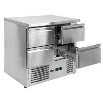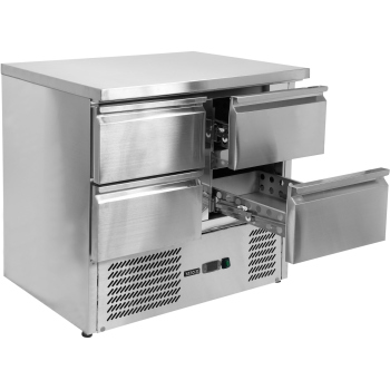 Entdecken Sie Zuverlässigkeit und Funktionalität mit dem 4-Schubladen-Kühltisch mit Arbeitsplatte der Marke YATO YG-05280. Die ideale Lösung für die professionelle Gastronomie.