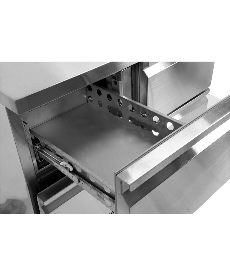 Dieses Modell zeichnet sich durch 4 selbstschließende Schubladen aus, die mit ergonomischen Griffen ausgestattet sind, was einen hohen Bedienkomfort und eine effiziente Raumorganisation gewährleistet. Die Schubladen sind ideal für die Lagerung von GN 1/1 Behältern sowie Flaschen mit einer maximalen Höhe von 150 mm geeignet und bieten vielseitige Lagermöglichkeiten.