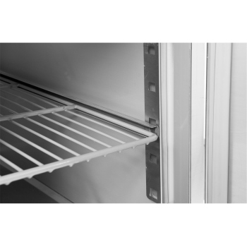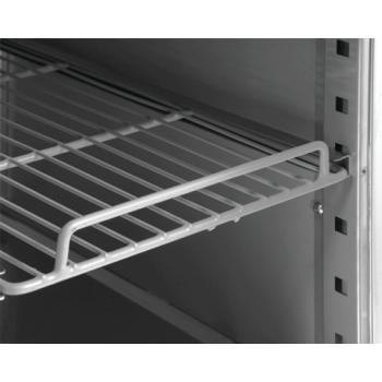 Die Funktionalität wird durch das System der selbstschließenden Tür erhöht, die zur Sicherheit mit einem Schloss und einem ergonomischen Griff ausgestattet ist. Das Innere des Schranks bietet Platz für 3 PVC-beschichtete Gitter-Regale, jedes mit einer beeindruckenden Tragfähigkeit von bis zu 40 kg (bei gleichmäßiger Belastung), ideal zur Aufbewahrung von GN 2/1 Behältern. Zusätzlich verfügt die Kühlkammer über eine energieeffiziente LED-Beleuchtung, die eine hervorragende Sichtbarkeit gewährleistet.