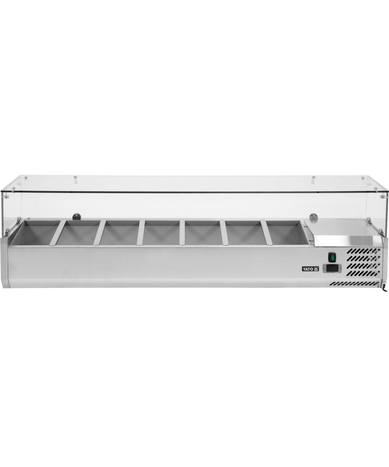 Diese innovative Kühlaufsatzvitrine der Marke YATO ist die ideale Lösung für die professionelle Lagerung von Zutaten wie frischem Gemüse für Salate, Pizzabelägen oder Sandwichzutaten, wobei deren optimale Frische gewährleistet ist. Ihr modernes Design, kombiniert mit der Verwendung hochwertigster Rohstoffe, macht die YATO Vitrine zu einem eleganten und funktionalen Ausstattungsmerkmal für jedes Restaurant, jede Pizzeria, Bar oder jedes Hotel, das den Inhalt perfekt zur Geltung bringt.