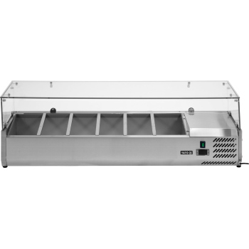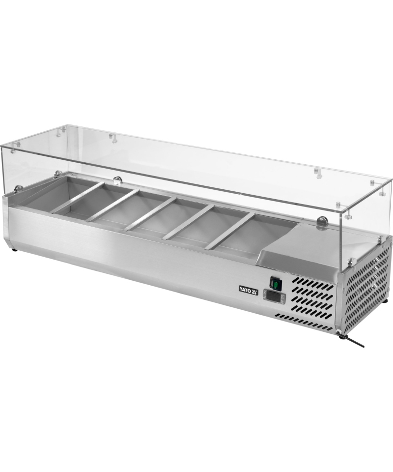 Die kompakten Abmessungen der YATO Kühlvitrine (1400 x 335 x 435 mm) verbergen ein beeindruckendes Fassungsvermögen, das die bequeme Lagerung von bis zu 6 GN 1/4 Behältern mit einer maximalen Tiefe von 150 mm ermöglicht, was den Arbeitsbereich optimiert.