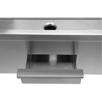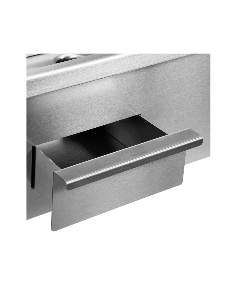 Ein zusätzlicher Vorteil sind die Seiten- und Rückwände, die mit einem 75mm hohen Schutzrand ausgestattet sind, der zubereitete Speisen effektiv vor dem Herunterfallen schützt und die Umgebung vor Fettspritzern bewahrt. Die Stabilität des Geräts auf jeder Arbeitsfläche wird durch vier rutschfeste Füße gewährleistet, die eine sichere und feste Position während des intensiven Gebrauchs bieten.