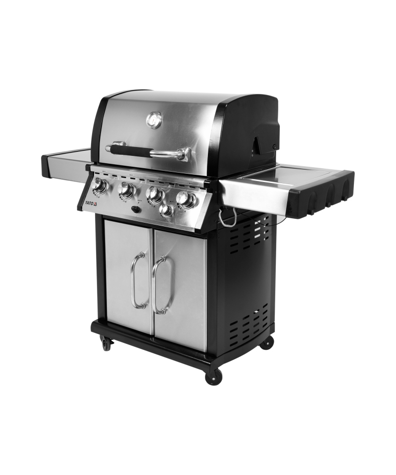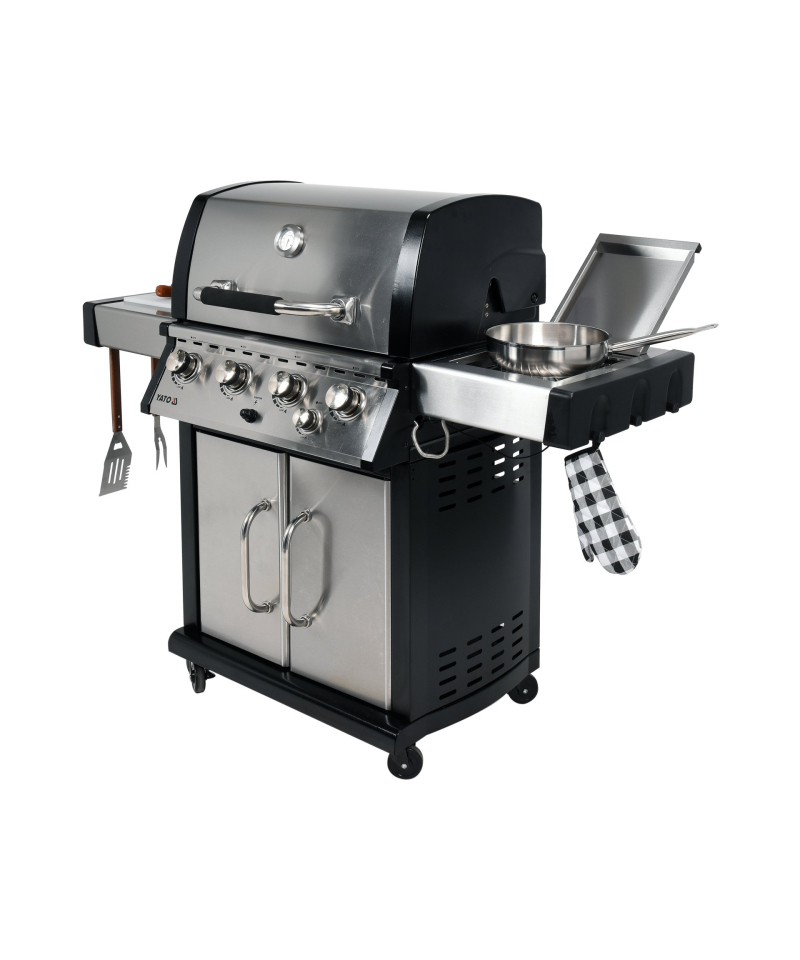 Entdecken Sie den Höhepunkt der kulinarischen Möglichkeiten mit dem exklusiven YATO 4+1 Gasgrill, dem größten in unserer Kollektion. Hergestellt aus hochwertigstem Edelstahl, besticht er durch einen soliden Gusseisenrost, der hervorragende Grillergebnisse garantiert. Praktische Seitenablagen mit Haken und ein geräumiger, abschließbarer Schrank bieten den idealen Platz für Gewürze und Zubehör und halten den Grillbereich ordentlich. Ein zusätzlicher 3,5-kW-Seitenbrenner ist eine vielseitige Lösung zum Kochen und Erwärmen von Speisen in Töpfen oder Pfannen und erweitert Ihre kulinarischen Horizonte.