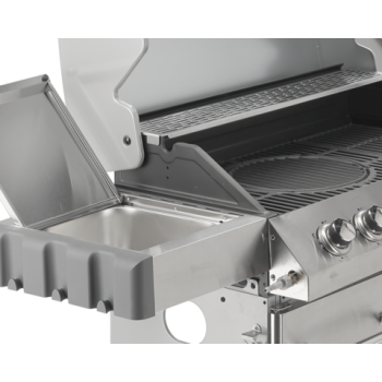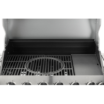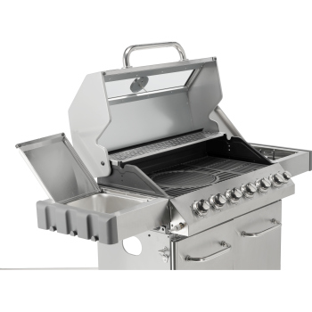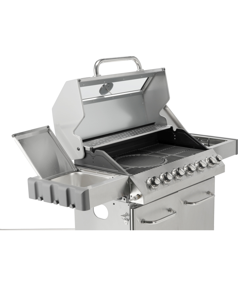 Dieser moderne 6+1 Gasgrill, hergestellt aus hochwertigem Edelstahl, ist die Quintessenz von Funktionalität und Stil. Ausgestattet mit einem robusten Gusseisenrost mit beeindruckenden Maßen von 82 x 41,5 cm, bietet er hervorragende Bedingungen zum Grillen. Praktische Seitenablagen und ein geräumiger, abschließbarer Schrank bieten bequemen Stauraum für Gewürze und alle notwendigen Accessoires. Der Seitenbrenner mit einer Leistung von 2,2 kW erweitert die kulinarischen Möglichkeiten und erlaubt das Kochen und Erwärmen von Speisen in einem Topf oder einer Pfanne. Der Bedienkomfort wird durch einen speziellen Platz für eine Gasflasche, einen eleganten Edelstahlbehälter, der in eine der Seitenablagen integriert ist, und einen eingebauten Flaschenöffner, immer griffbereit, erhöht.