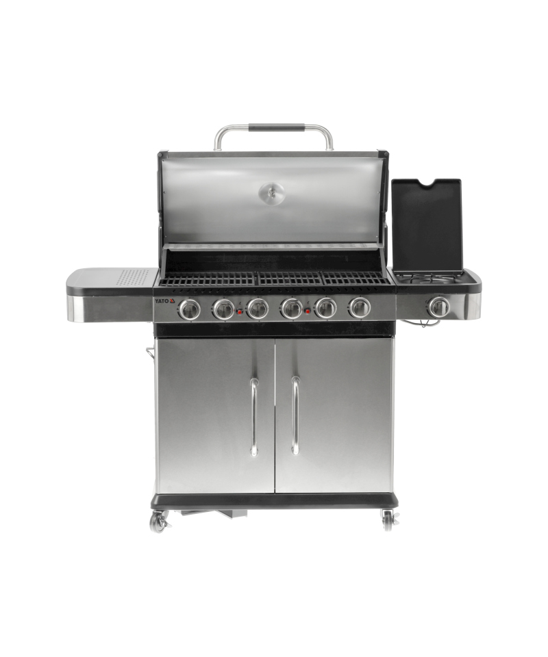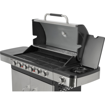 Entdecken Sie den 6+1 Gasgrill, der mit modernem Design und einer soliden Konstruktion aus Edelstahl begeistert. Ausgestattet mit einem robusten Gusseisenrost garantiert er hervorragende Grillergebnisse. Praktische Seitenablagen und ein geräumiger, abschließbarer Schrank bieten bequemen Platz für Gewürze und wichtiges Zubehör. Der zusätzliche 2,2 kW Seitenbrenner ist eine ideale Lösung zum Kochen und Erwärmen von Speisen in einem Topf oder einer Pfanne und erweitert Ihre kulinarischen Möglichkeiten.