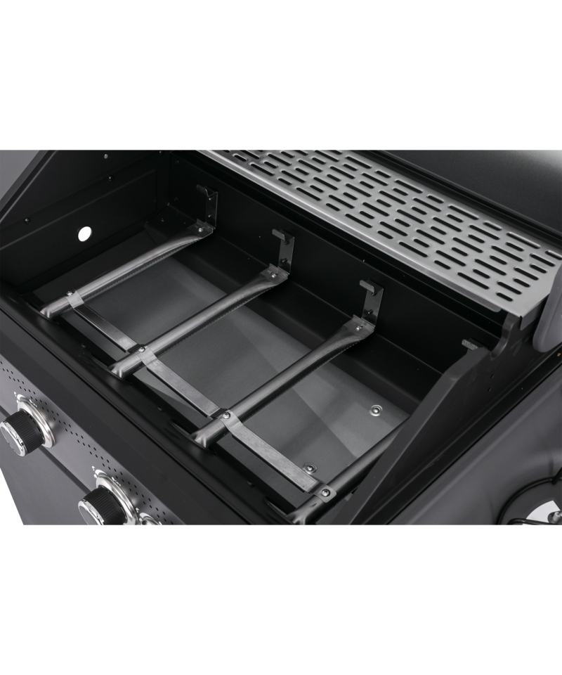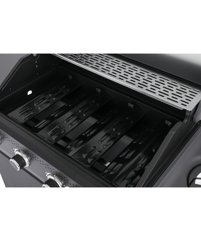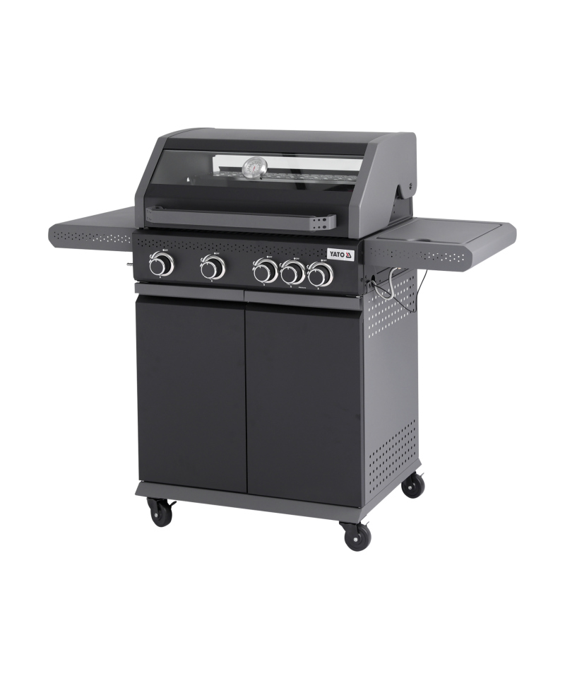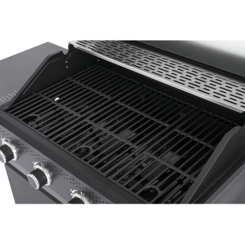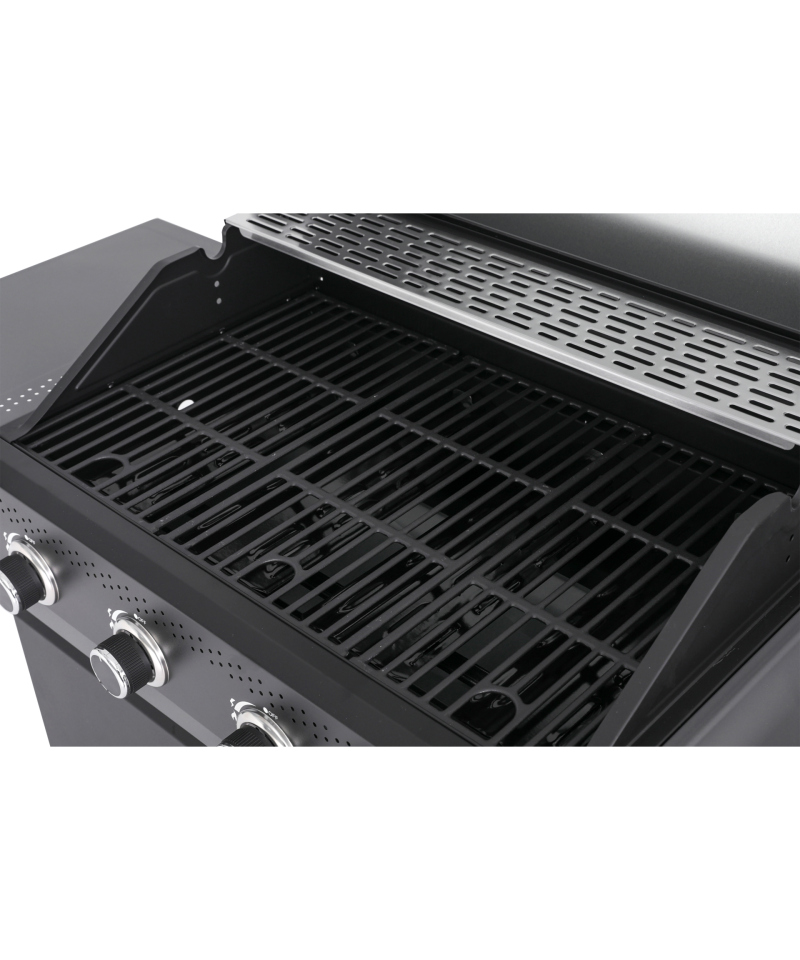 Mit vier Hauptbrennern und einem Seitenbrenner (4+1) bietet der Grill präzise Temperaturkontrolle und die Möglichkeit, mehrere Gerichte gleichzeitig zuzubereiten. Die gusseiserne Grillfläche von 68 × 42 cm sorgt für gleichmäßige Hitzeverteilung, während das Edelstahl-Warmhaltegitter fertig gegrillte Speisen optimal in Temperatur hält. Der gehärtete Glasdeckel ermöglicht die Kontrolle des Grillprozesses ohne Öffnen – Wärme und Aroma bleiben erhalten.