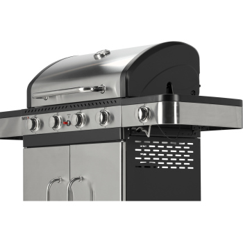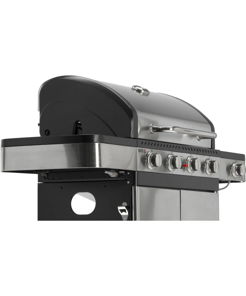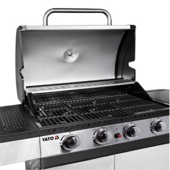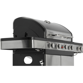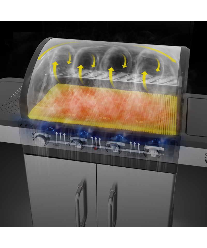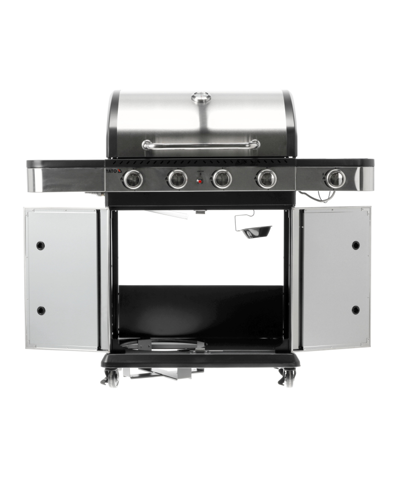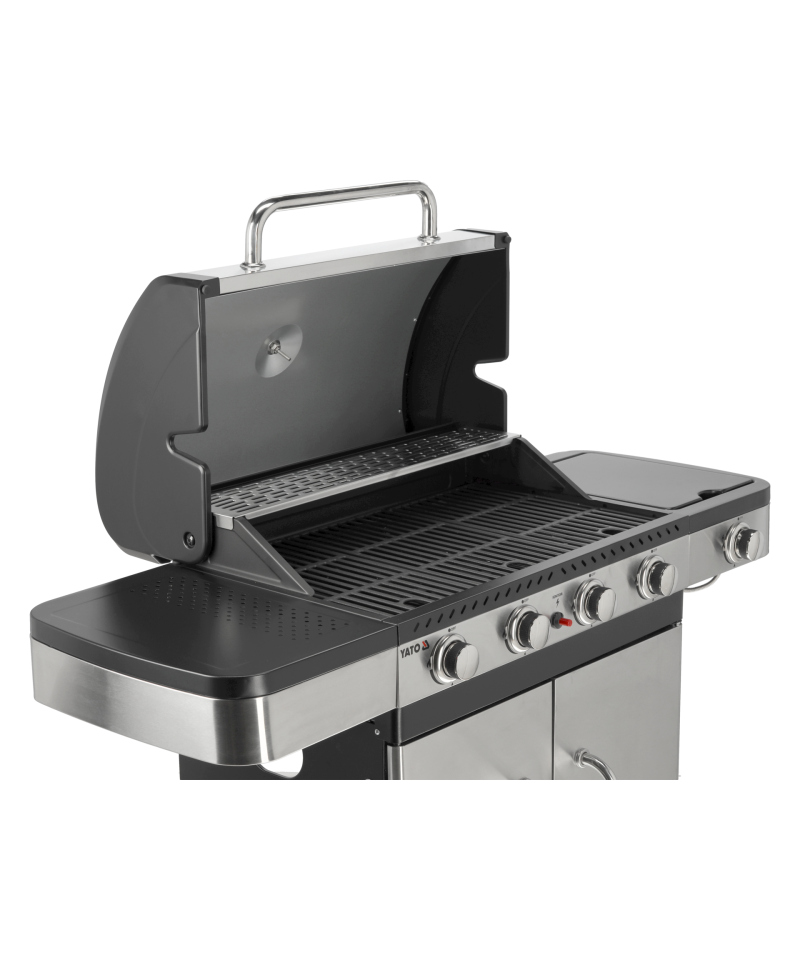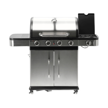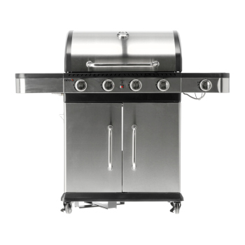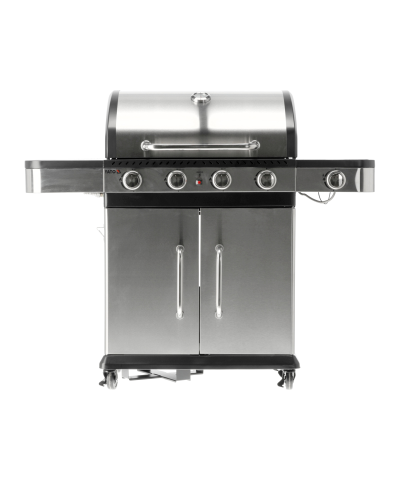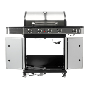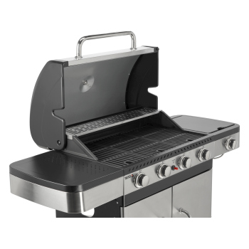 Ein moderner 4+1 Gasgrill, gefertigt aus hochwertigem Edelstahl, garantiert Langlebigkeit und ein elegantes Erscheinungsbild. Ausgestattet mit einem robusten, Gusseisenrost, sorgt er für hervorragende Grillergebnisse. Praktische Seitenablagen und ein geräumiger, abschließbarer Schrank bieten bequemen Stauraum für Gewürze und alle notwendigen Accessoires.