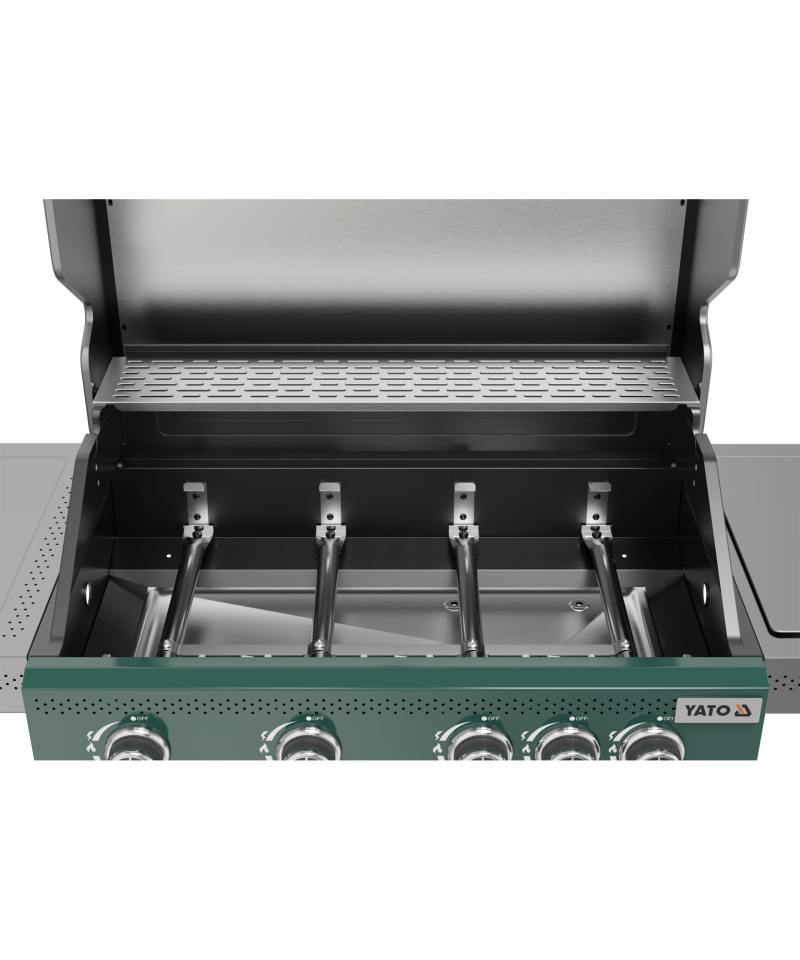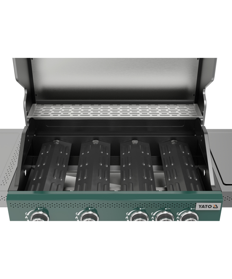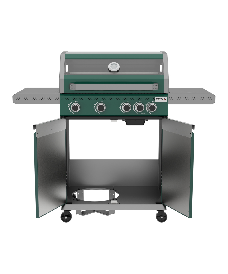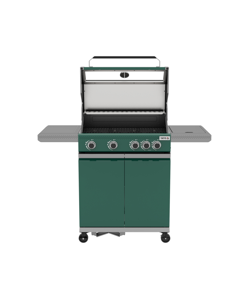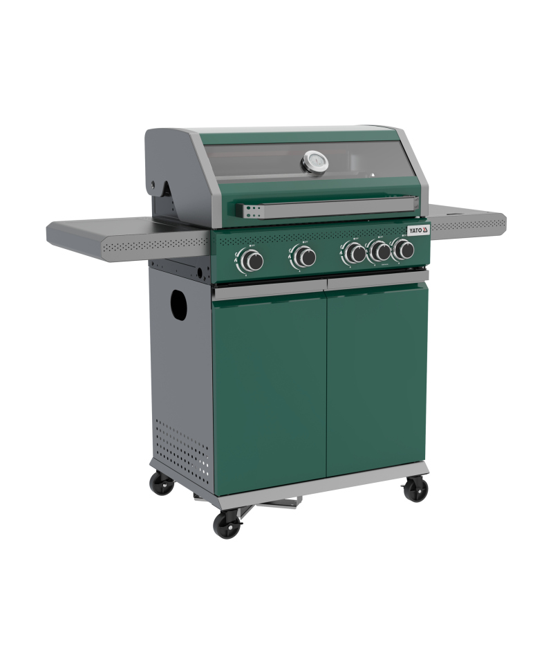 Entdecken Sie Modernität und Funktionalität mit dem 4 + 1 Gasgrill aus der exklusiven YATO Itami Serie, der sich durch seine einzigartige grün-graue Farbgebung auszeichnet. Das Herzstück des Geräts ist ein zuverlässiger Gusseisenrost mit einer beeindruckenden Fläche von 68 x 42 cm, ergänzt durch einen praktischen Warmhalterost aus Edelstahl. Mit einer Gesamtbrennerleistung von 14,2 kW garantiert der Grill hervorragende kulinarische Ergebnisse. Durchdachte Seitenablagen und ein geräumiger, abschließbarer Schrank bieten bequemen Stauraum für Gewürze und alle notwendigen Accessoires.