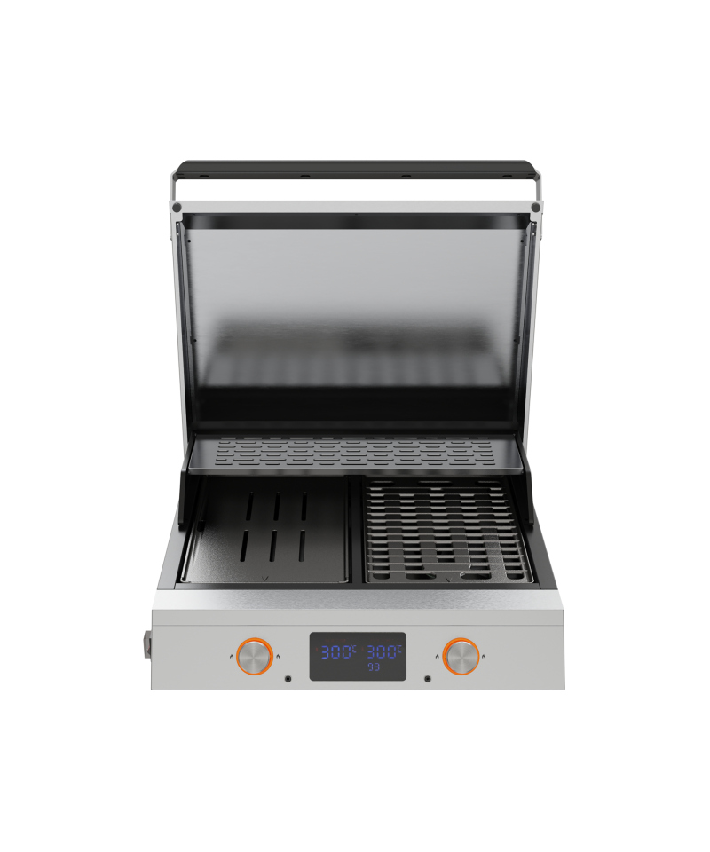 - Intuitives 3-in-1 Digital-Bedienfeld mit übersichtlichem LED-Display bietet volle Kontrolle über den Grillvorgang. Es ermöglicht eine präzise Temperatureinstellung, Timer-Einstellung und die Überwachung der Kerntemperatur der Speisen.