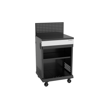 Tischplatte mit hinterem Rand (Typ C). 4-seitig geschlossenes Untergestell mit unterer Ablage und verstellbarem Fachboden. Linke Seite mit 3 kastenförmigen Schubladen. Schwenktür. Schubladenblock kann auch auf der rechten Seite positioniert werden.