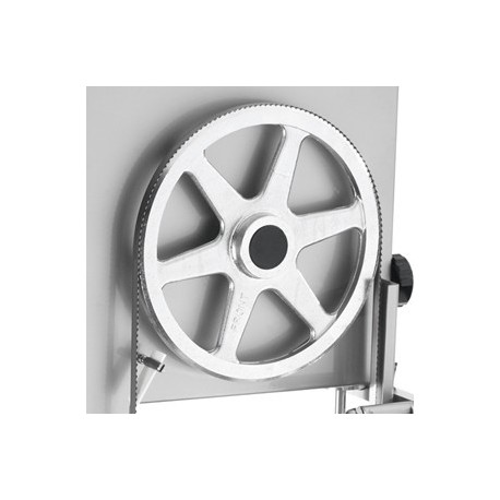 Die Säge wurde für einfache Reinigung und Wartung entwickelt. Die Tür ist leicht abnehmbar, wodurch der Zugang zum Inneren des Geräts erleichtert wird. Die Riemenscheiben sind kalibriert und aus poliertem Aluminium gefertigt, und die obere Riemenscheibe ist mit einem Schnellspannmechanismus ausgestattet, der eine schnelle und bequeme Reinigung sowie einen Messerwechsel ermöglicht.