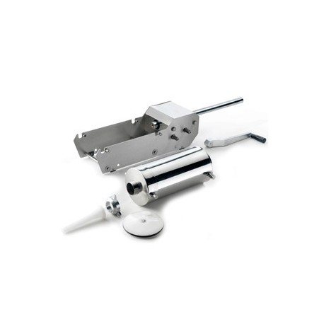 Die IS 16 X Füllmaschine bietet ein Gehäuse und einen Zylinder aus Edelstahl AISI 304, einen robusten, an der Bodenplatte doppelt verschweißten Zylinder, Nylonkolben mit Auslassventil, ein Getriebe aus verzinktem Stahl, geschliffene und gehärtete Stahlzahnräder, Zahnräder, die sich auf 4 abgedichteten Lagern bewegen, sowie ein zweistufiges Getriebe, das verschiedene Geschwindigkeiten ermöglicht. Im Lieferumfang befinden sich 3 Nylon-Trichter zum Befüllen und eine Spannvorrichtung. Optional ist ein Stahlgestell für zusätzliche Stabilität erhältlich.