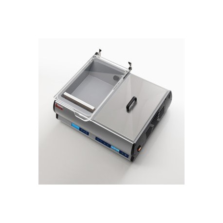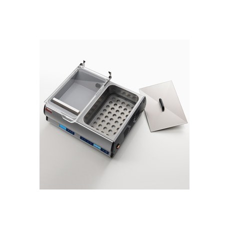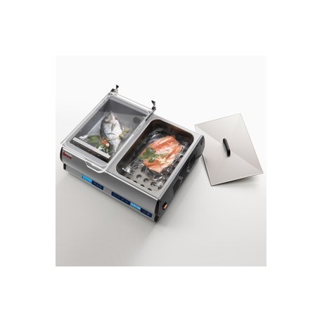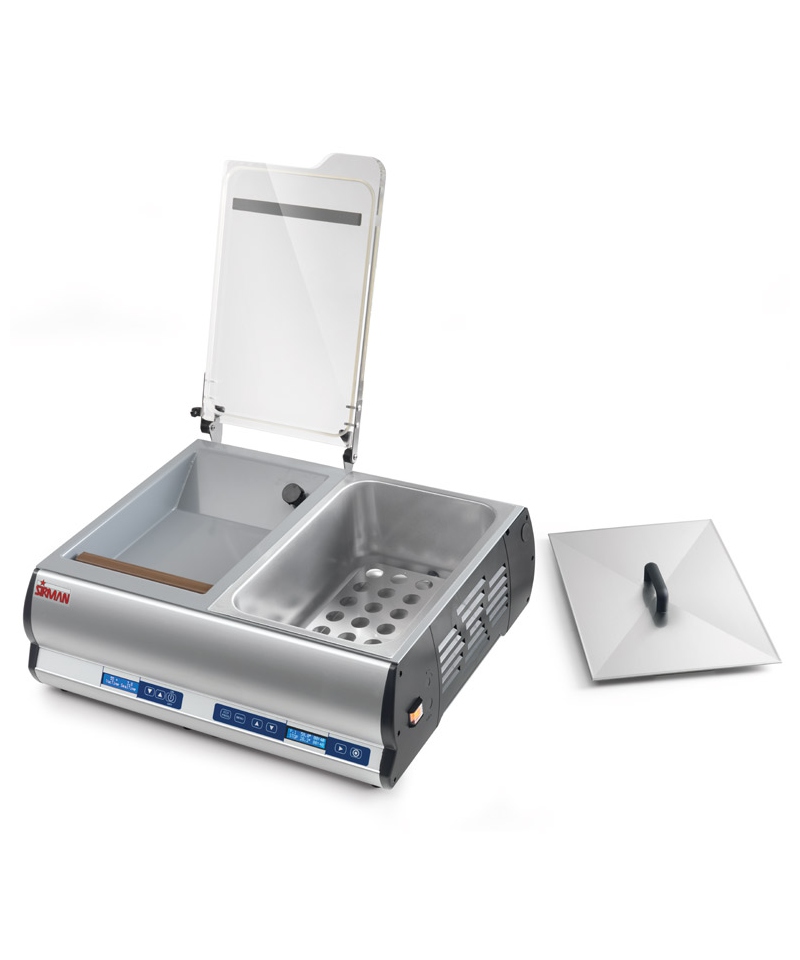 Das Gerät ist außerdem mit einem statischen Sous-Vide-Garsystem ausgestattet, mit robusten, geschützten Heizelementen am Boden des aus Edelstahl AISI 304 gefertigten Behälters. Das elektronische Temperatursteuerungssystem mit Temperatur- und Laufzeit-Anzeige sorgt für präzise Ergebnisse.
