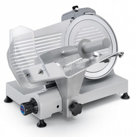 Einer der Hauptvorteile dieser Scheibenmaschine ist der ergonomische, aus Aluminium-Druckguss gefertigte Lebensmittelanschieber, ausgestattet mit Zähnen, die ein sicheres Halten des zu schneidenden Produkts ermöglichen. Der große Abstand zwischen Messer und Motor erleichtert die Reinigung des Geräts und gewährleistet ein hohes Maß an Hygiene.