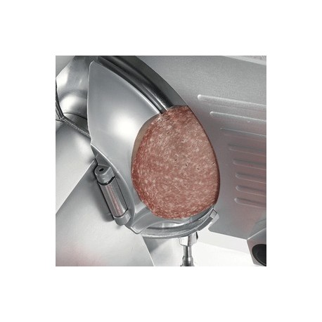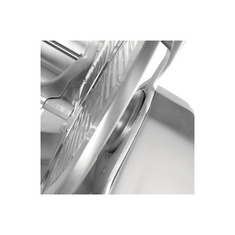 Nicht nur Funktionalität, sondern auch Liebe zum Detail zeichnen diese Scheibenmaschine aus. Schrauben und Deflektor aus Edelstahl verleihen ihr Eleganz, und die gegossene Messerschleifvorrichtung kann als Symbol für Präzision angesehen werden. Die kompakten Abmessungen sparen wertvollen Platz im Geschäft, während die Scheibenmaschine gleichzeitig eine hervorragende Schnittleistung beibehält.