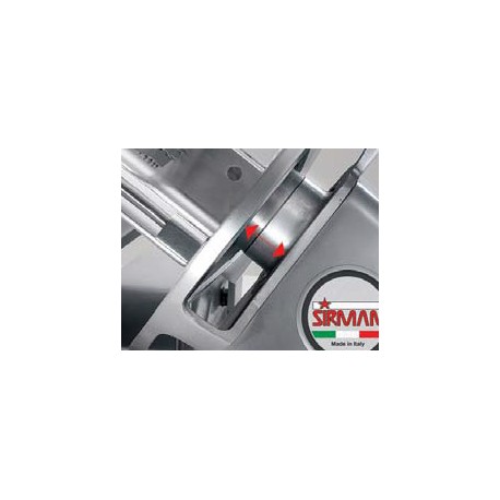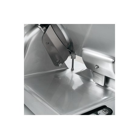 Die Scheibenmaschine ist mit einem verchromten und geschliffenen, verschiebbaren Schlitten ausgestattet, der einen flüssigen und präzisen Lauf während des Schneidens gewährleistet. Die gegossenen Schlittenbuchsen erleichtern zusätzlich die komfortable und zuverlässige Bedienung des Geräts. Die Anschläge am Wagen aus vulkanisiertem Gummi ermöglichen ein gleichmäßiges Schneiden und die Einhaltung der gewünschten Schnittstärken.