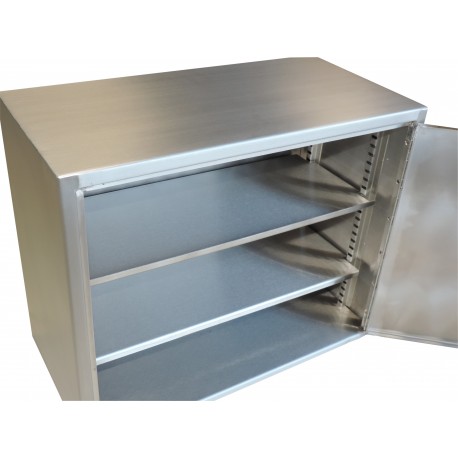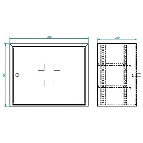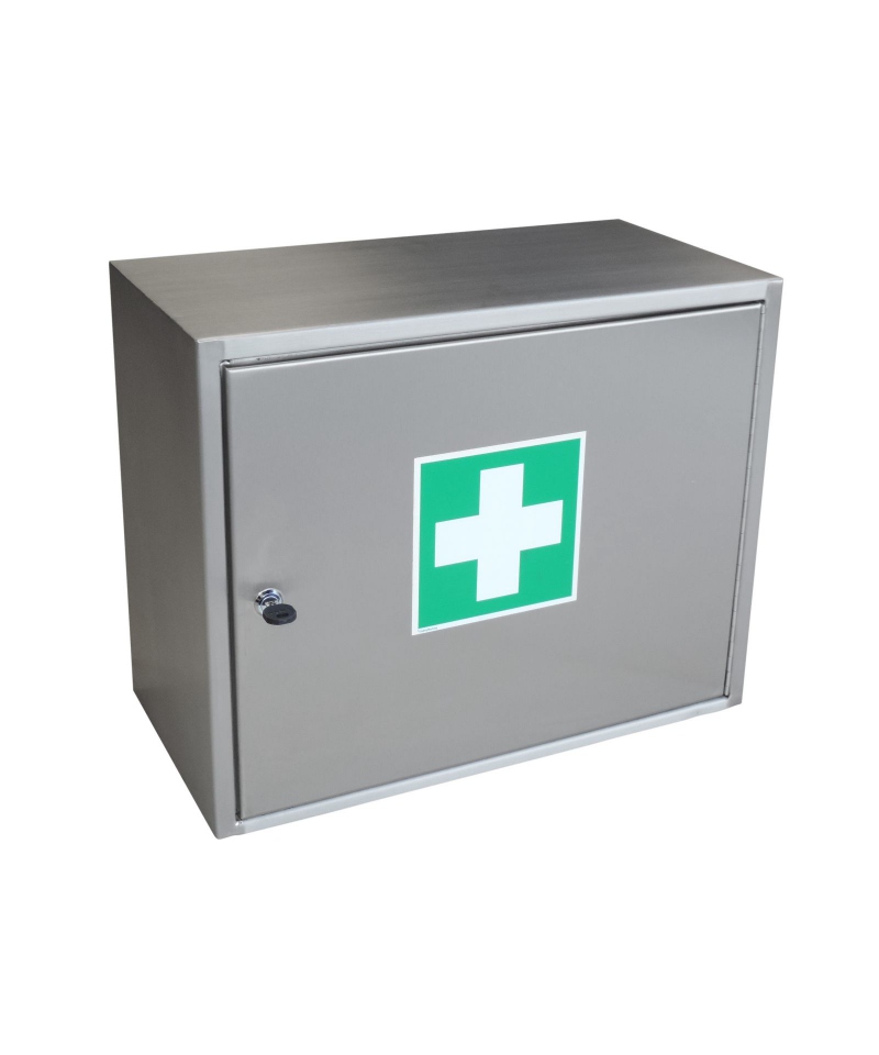 Medikamentenschrank zur Aufbewahrung von Verbandsmaterial (Verbände und Pflaster), Erste-Hilfe-Material und Medikamenten. Der Schrank ist für die Lebensmittel- und Fleisch verarbeitende Industrie bestimmt. Er ist komplett aus säurebeständigem Stahl gefertigt, der höchste hygienische Anforderungen erfüllt. Er verfügt über zwei bewegliche Einlegeböden, die einfach auf unterschiedlichen Höhen eingestellt werden können. Verschließbar mit Schlüssel.