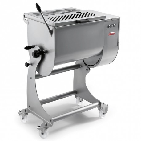 Der Sirman Fleischkutter, Modell IP 50 XP BA, ist ein professionelles Gerät, das effizientes Fleischkneten ermöglicht. Er bietet zahlreiche Funktionen, die eine hohe Leistung und einfache Bedienung gewährleisten. Ausgestattet mit drehbaren Edelstahlrädern mit Feststellbremse, sorgt er für Stabilität während des Betriebs. Das System aus zwei Rührarmen ermöglicht ein gründliches und gleichmäßiges Kneten des Fleisches. Die Rührarme bestehen aus Edelstahl AISI 304 und sind ohne Werkzeug leicht abnehmbar, was die Reinigung und Wartung vereinfacht.
