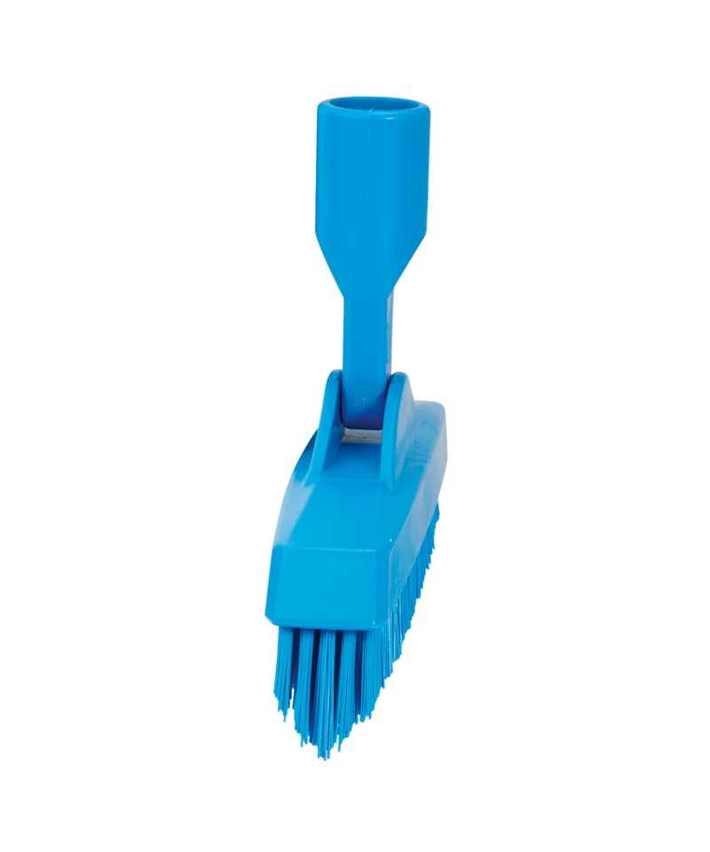 Multifunktionale Bürste aus einer Kombination aus Polypropylen, Polyester und Edelstahl. Ideal zur Reinigung von Spalten, Fugen und schwer zugänglichen Stellen, z.B. unter Geräten oder zwischen Schränken. Das bewegliche Bürstengelenk ermöglicht die Positionierung des Stiels parallel zum Boden und erweitert die Anwendungsmöglichkeiten. Die angebrachten pfeilförmigen Fasern gewährleisten eine sehr effektive Reinigung selbst kleinster Risse, Fugen und Spalten. Die mittlere Reihe steiferer Borsten macht sie zu einer sehr harten Schrubbbürste. Neueste Technologie gewährleistet maximale Hygiene und Sicherheit. Für Unternehmen der Lebensmittelindustrie bestimmt.