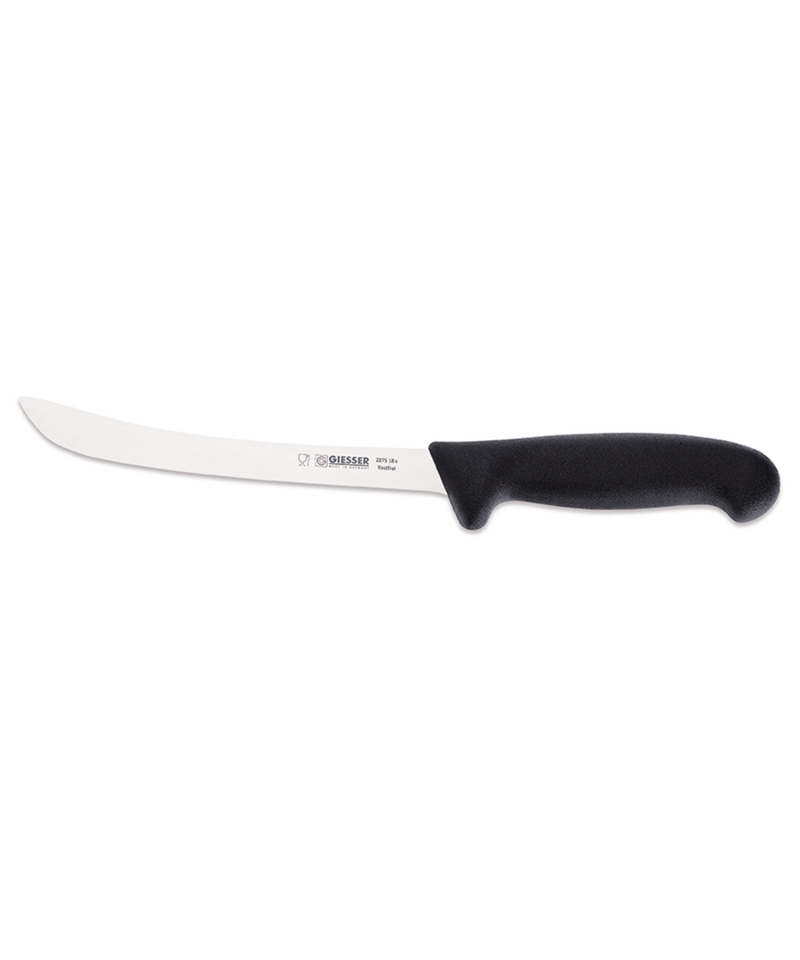 Messer mit 18 cm Klingenlänge der deutschen Marke Giesser. Hergestellt aus Chrom-Molybdän-Stahl, vakuumgehärtet auf 56-57 Rockwell. Die hochglanzpolierte Klinge ist in einen Griff aus TPE eingelassen. Das Messer ist sehr hygienisch und liegt dank des ergonomisch geformten Griffs sehr gut in der Hand. Darüber hinaus hat der Griff eine raue Struktur und ist daher rutschfest.