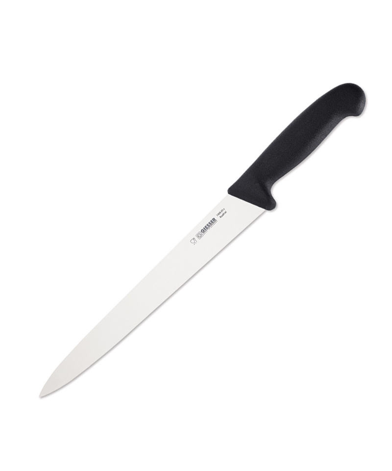 Messer zum Aufschneiden von Wurstwaren, ideal geeignet für Metzgereien, Gastronomiebetriebe und Imbisse. Neben Wurst, Aufschnitt und Fleisch können auch Obst und Gemüse damit geschnitten werden. Die Klinge besteht aus hochwertigem Chrom-Molybdän-Stahl, der im Vakuumverfahren auf 56-57 Rockwell gehärtet wurde. Gerade Schneide und spitze Spitze, 25 cm lange Klinge. Die mattpolierte Schneide sorgt für optimale Rostbeständigkeit. Um sicherzustellen, dass jedes Messer von Anfang an perfekt geschliffen ist, erfolgt das Endschleifen bzw. das Feinschärfen von Hand.