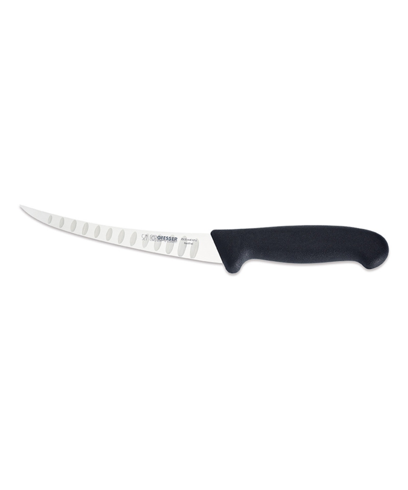 Schälmesser, gebogene, halbflexible Klinge. Klingenlänge 13 cm. Dieses hochwertige Messer hat eine halbflexible, dünne, ultrascharfe Klinge, die Knochen präzise vom Fleisch trennt. Ideal für Fleischereien und Fischereien.