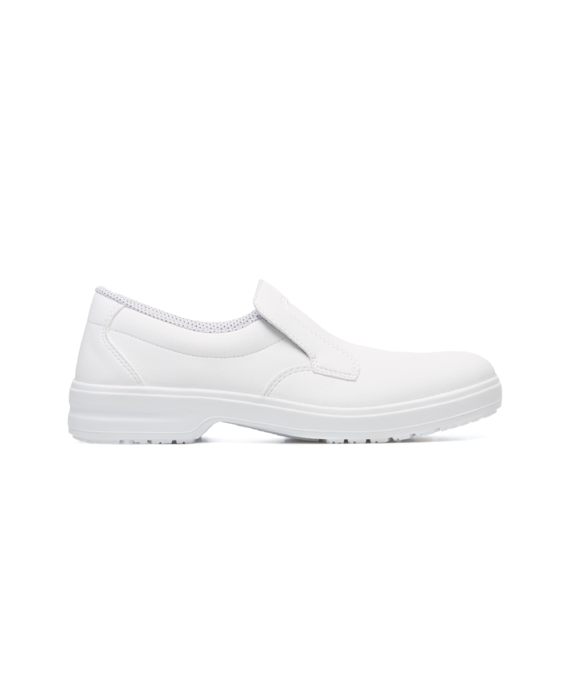Arbeitsschuhe, Halbschuhe, Schlupfmodell in weiß. Für den Einsatz in der Lebensmittel- und Fleisch verarbeitenden Industrie bestimmt. Wasserdicht mit rutschfester Sohle, bequem. Texfiber – weiches und atmungsaktives Obermaterial, waschbar bei 40 °C.