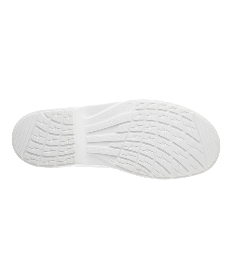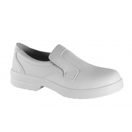 Italienische Marke Safeway. Niedrige weiße Arbeitssicherheitsschuhe, Schlupfmodell, für den Einsatz in der Lebensmittel- und Fleisch verarbeitenden Industrie.