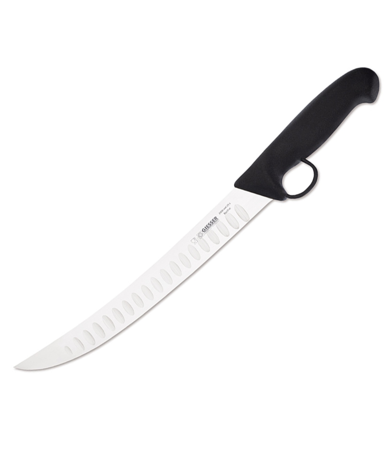Professionelles Seziermesser der deutschen Marke Giesser, mit gebogener Klinge, die rundum geriffelt ist. Das Messer ist für die Fleischindustrie konzipiert und wird zum Schneiden von Kadavern verwendet. Die Klinge besteht aus rostfreiem Chrom-Molybdän-Stahl, vakuumgehärtet auf eine Härte von 56-57 Grad Rockwell. Die Rillen auf der Klinge verringern die Reibung und sorgen dafür, dass das Messer über das Schneidgut gleitet und das Fleisch nicht an der Klinge kleben bleibt. In der Endfertigung wird die Klinge von Hand auf Hochglanz geschliffen, was die Rostbeständigkeit und Haltbarkeit der Klinge erhöht.