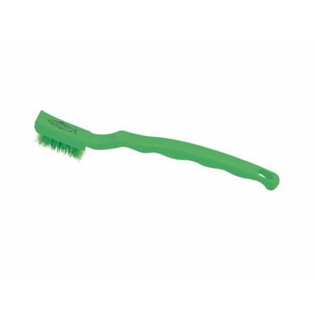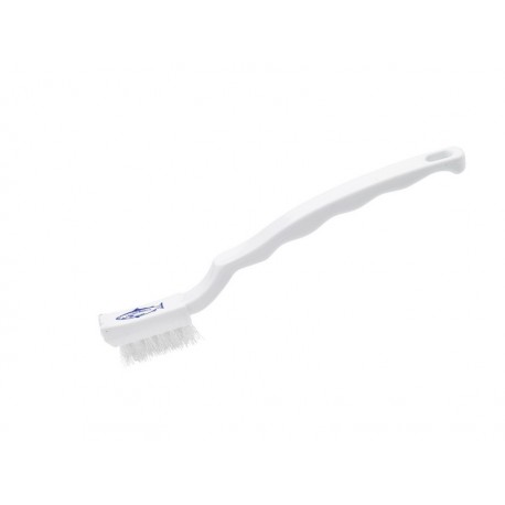 Wir präsentieren Ihnen eine 180 mm lange Fugenbürste, die sich durch einen robusten Polypropylenblock und eine Füllung aus mittelstarkem Polyesterfasergemisch mit Harz auszeichnet. Diese Bürste, die etwa die Größe einer Zahnbürste hat, ist ein ausgezeichnetes Werkzeug für präzise Arbeiten und die effektive Reinigung schwer zugänglicher Stellen an Maschinen. Ein besonderes Merkmal dieser Bürste ist ihre kleine, spitze, meißelartige Spitze, mit der sich hartnäckige Verschmutzungen leicht entfernen lassen.