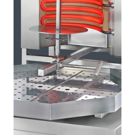 Die Drehbewegung des zu röstenden Fleisches (d.h. der Walze) wird durch eine elektrische Antriebseinheit gewährleistet, die sich an der Oberseite des Toasters befindet. Der Elektromotor ist mit einem entsprechenden Schalter ausgestattet, der die Drehung des eingelegten Fleisches in beide Richtungen ermöglicht.