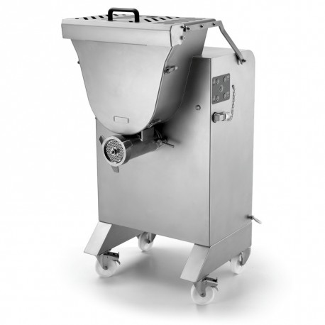 Zur Standardausstattung gehören ein selbstschärfendes Edelstahlmesser und eine 6 mm starke Lochscheibe, ein Bodenständer mit Edelstahlrollen und Bremse sowie ein Werkzeug zum Ausbau der Schnecke und der Lochscheibe. Der Fleischwolf bietet volle Kontrolle über den Zerkleinerungs- und Kutterprozess durch die Timerfunktion sowie die Rücklauffunktion mit Zeitschaltuhr für den Fleischkutter.