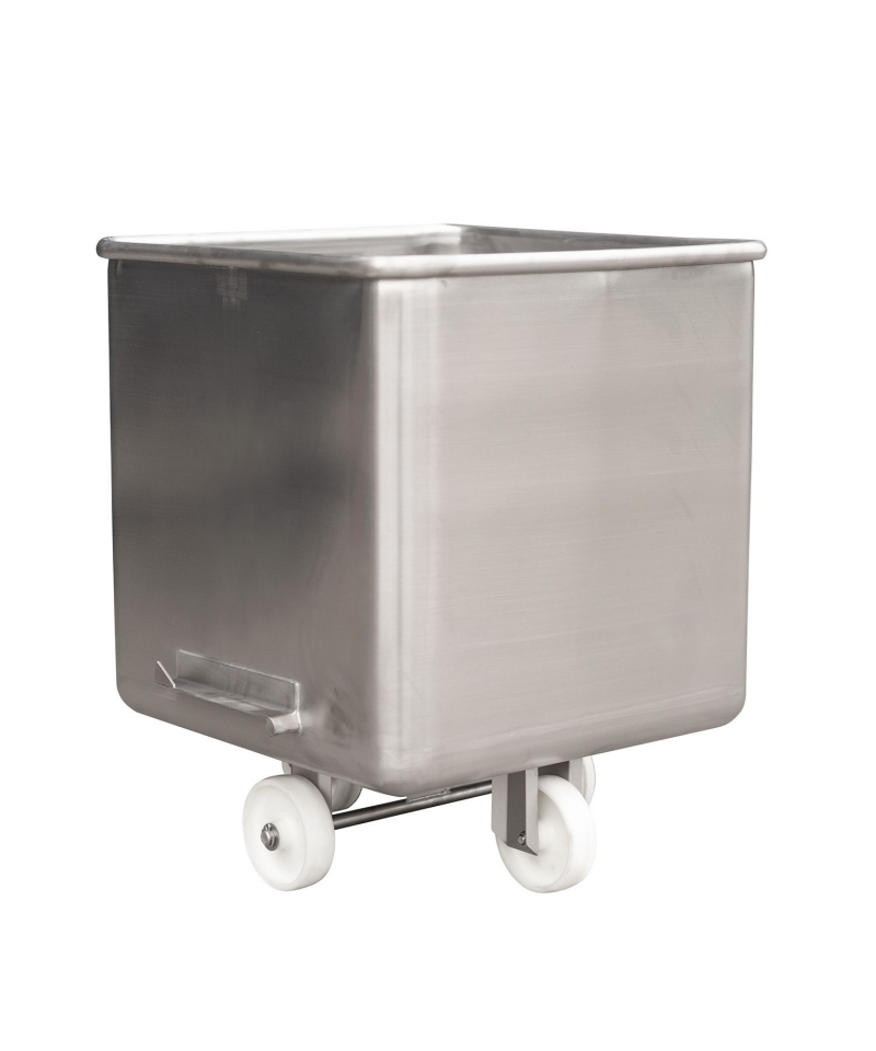 Cymber mit einem Fassungsvermögen von 300 l, konzipiert für den Transport von Rohstoffen und Halbfertigprodukten in Lebensmittel- und Fleischverarbeitungsbetrieben. Er kann auch zum Pökeln von Fleischprodukten verwendet werden. Hergestellt aus Edelstahl 1.4301 und ausgestattet mit vier kippbaren Rädern. Hergestellt in Übereinstimmung mit DIN 9797.