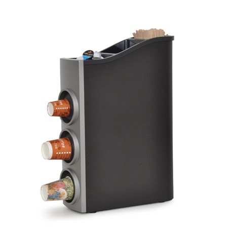 Robuster und stabiler Behälter für den Becherabgabespender aus Metall mit Kunststoffabdeckung und drei verschiedenen Becherabgabe-Rohren sowie herausnehmbarem Portionseinschub. Die besonders schmale Bauweise ermöglicht eine Platzersparnis in diesem Behälter.