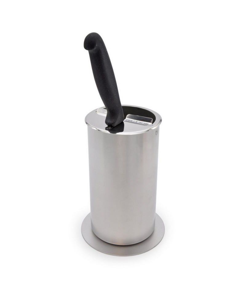 Der Schaber für Teigmesser aus Edelstahl ist in zwei Ausführungen erhältlich: eingebaut (Modell Tisch) und zum Einbau (Modell Installation). Er hat die Maße Ø x H: 130 x 190 mm und einen Schneid-Ø von 110 mm. Die Einbautiefe beträgt 190 mm.